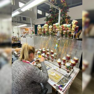Mieliśmy okazję zobaczyć cały proces tworzenia szklanych ozdób: od dmuchania szkła, przez srebrzenie i ręczne zdobienie, aż po dokładną kontrolę jakości. To niesamowite, ile pracy, precyzji i pasji kryje się w każdej jednej bombce!