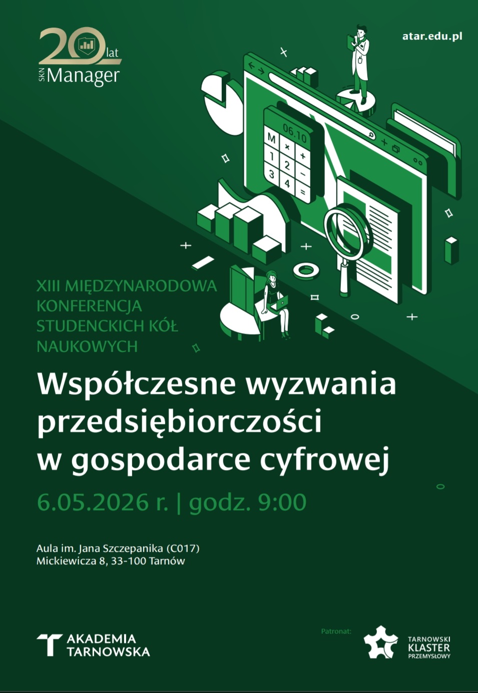 Serdecznie zapraszamy do udziału w XIII Międzynarodowej Konferencji Studenckich Kół Naukowych „Współczesne wyzwania przedsiębiorczości w gospodarce cyfrowej”, organizowanej przez Studenckie Koło Naukowe MANAGER przy Wydziale Prawa, Administracji i Ekonomii na Akademia Tarnowska.